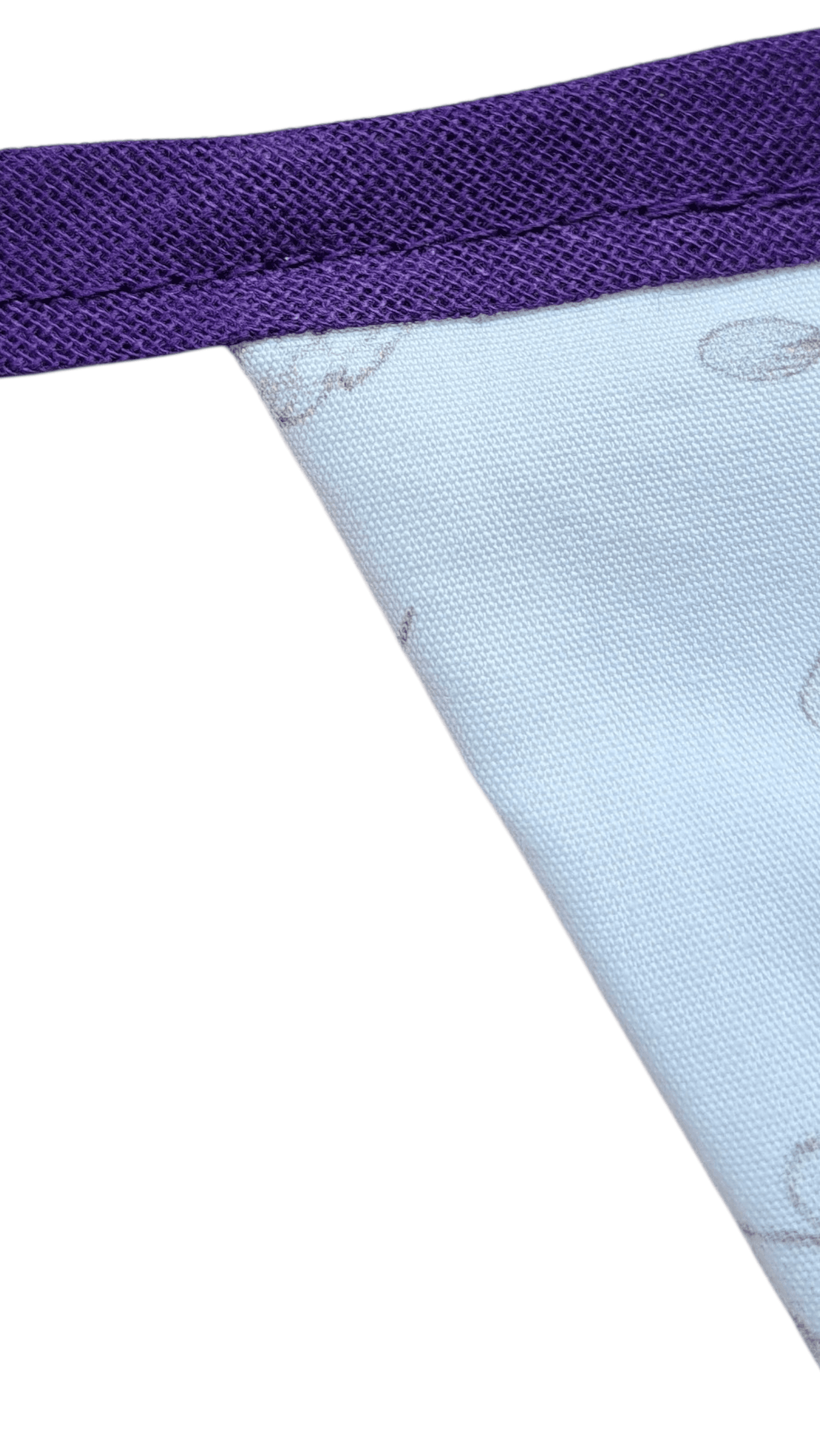 Katoenen vlaggenlijn, verschillende varianten. Witte achtergrond met beige kleurige bloemen met een lijn in lila, donkerpaars, mintgroen, wit of beige.